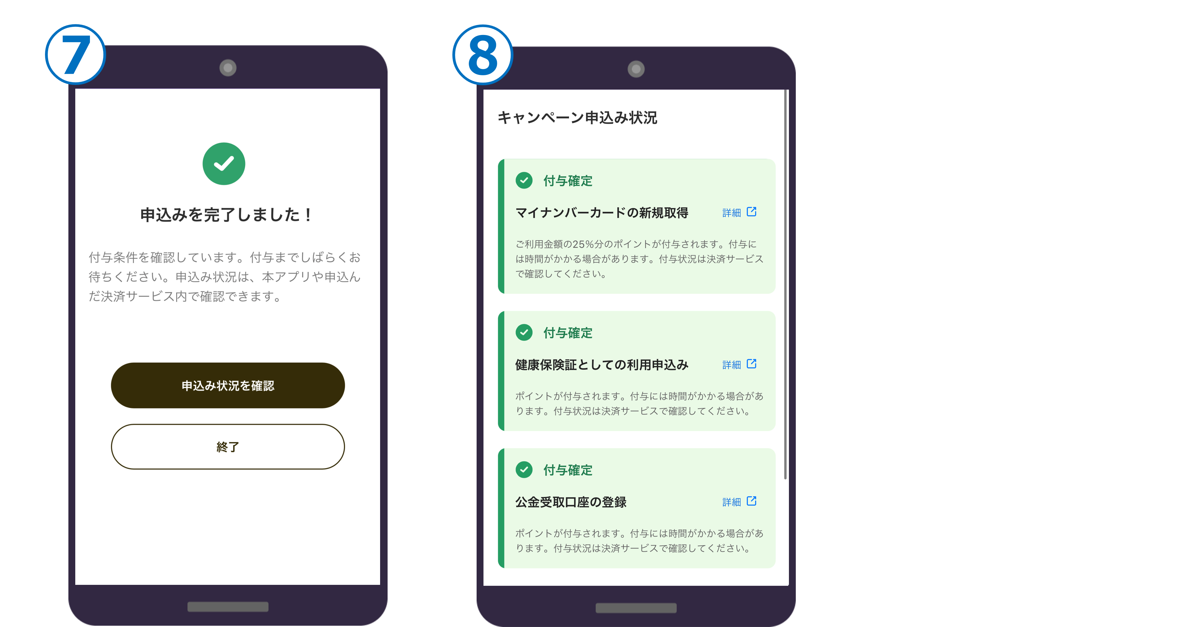⑧「申込み状況を確認」を押すことで、それぞれのマイナポイントの申込み状況を照会することが可能です。